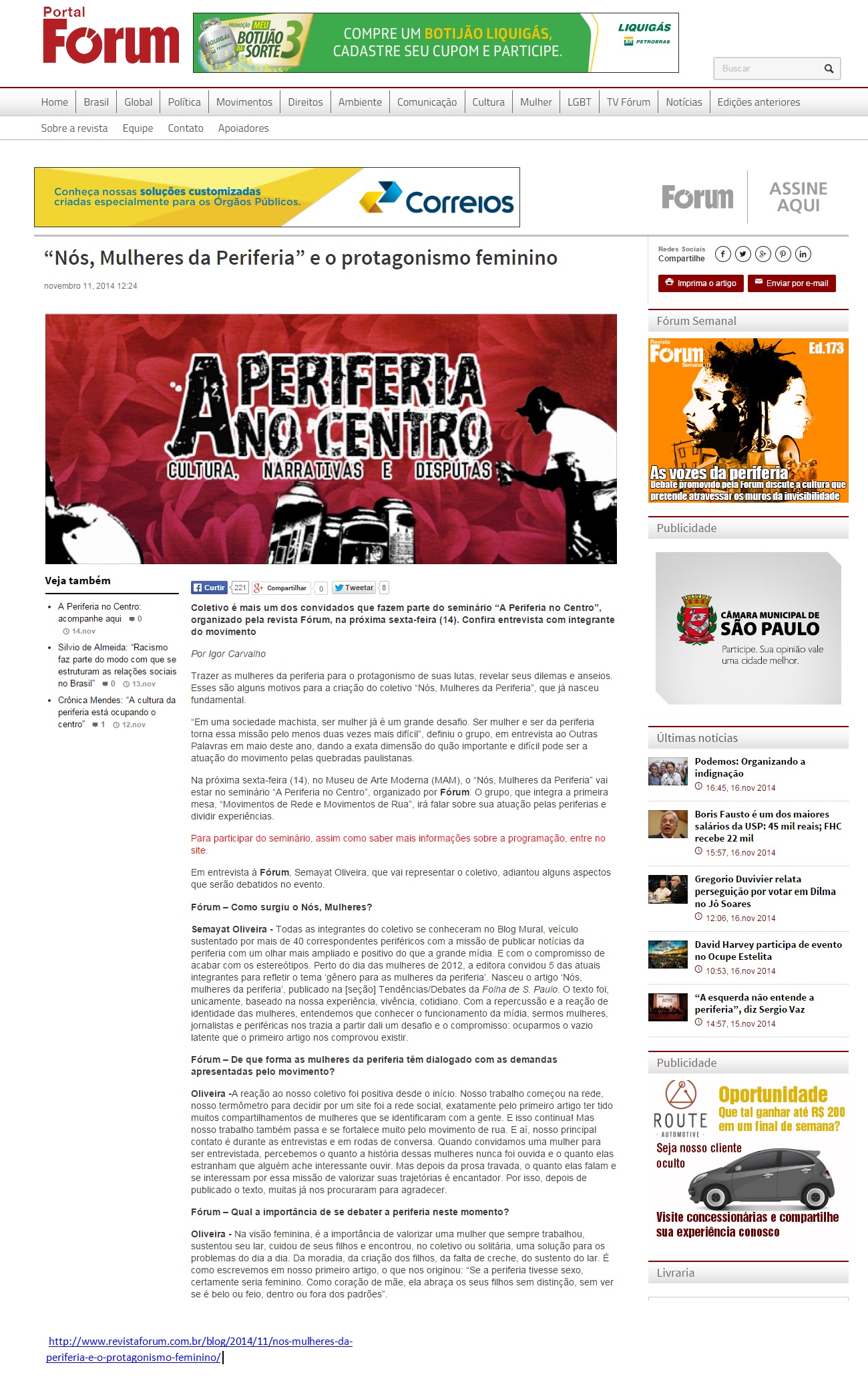 Entrevista com Semayat Oliveira, publicada no site da Revista Fórum, no dia 11 de novembro de 2014, sobre o Coletivo Nós, mulheres da periferia.