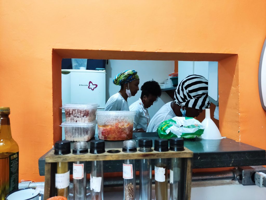 Esse auto-reconhecimento veio com os trabalhos que realizava no coletivo Mulheres de Ori, formado por mulheres negras da Cidade Tiradentes, do qual é uma das fundadoras. Começou a cozinhar em eventos e ver seu trabalho sendo valorizado. “Eu comecei a circular em lugares que o meu saber era valorizado e reconhecido, as pessoas não ficavam barganhando preço, foi quando eu vi que realmente poderia virar uma profissão”, lembra.