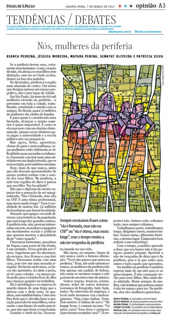 Artigo “Nós, mulheres da periferia” publicado no dia 7/3/2012, no Tendências e Debates da Folha de S. Paulo (versão impressa).