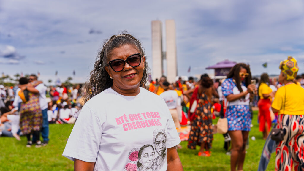 Elisangela dos Santos era um dos rostos na multidão que compôs a Marcha das Mulheres Negras por Reparação e Bem Viver. “Somos nós que estamos sofrendo e temos que correr atrás do fim desse sofrimento. Nós temos que mostrar a força da mulher negra, a força daquelas mulheres que morreram lá atrás lutando pelos direitos delas”, afirma.