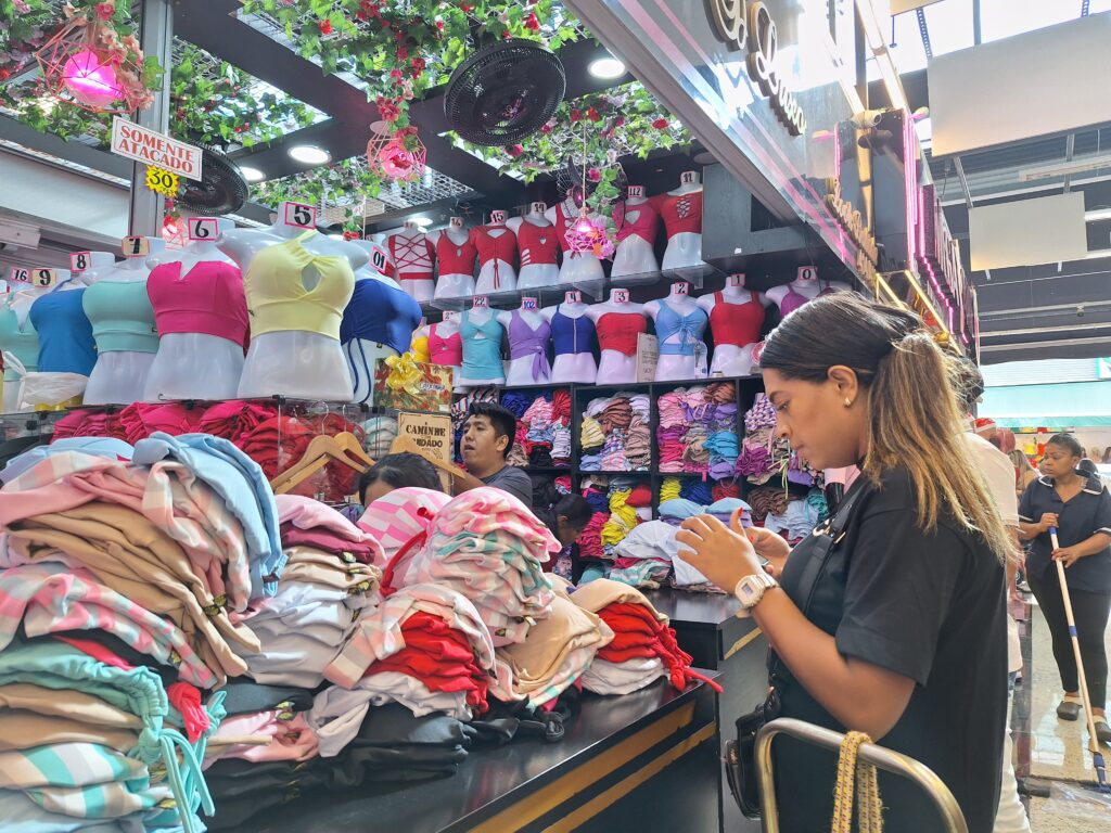 Pouco antes das 7h de uma quarta-feira, me encontrei com a vendedora Jéssica Martins em seu box de roupas no primeiro andar do Shopping Feira da Madrugada, localizado no Brás, região central de São Paulo (SP). Seu turno de trabalho havia começado bem antes: às 23h do dia anterior, em uma banca que divide com uma amiga na rua onde acontece a Feira da Madrugada, centro de comércio popular de vestuário que funciona a partir da meia noite e recebe compradores de todo país.