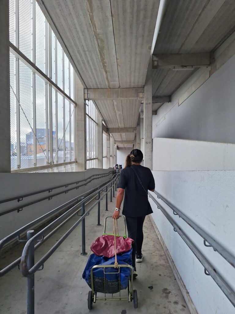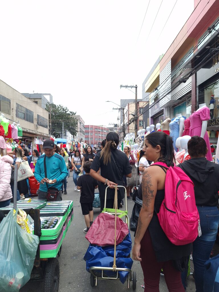 Lá, além de atender as clientes que vão até o local, Jéssica separa os pedidos feitos online – pelo Instagram ou plataformas Shein e Mercado Livre. Feito isso, pega o seu carrinho de compras e sai andando em direção a diferentes lojas da região para realizar as compras da assessoria. No período em que ela está na rua, suas “vizinhas” de box cuidam de sua loja e realizam as vendas caso apareçam clientes.