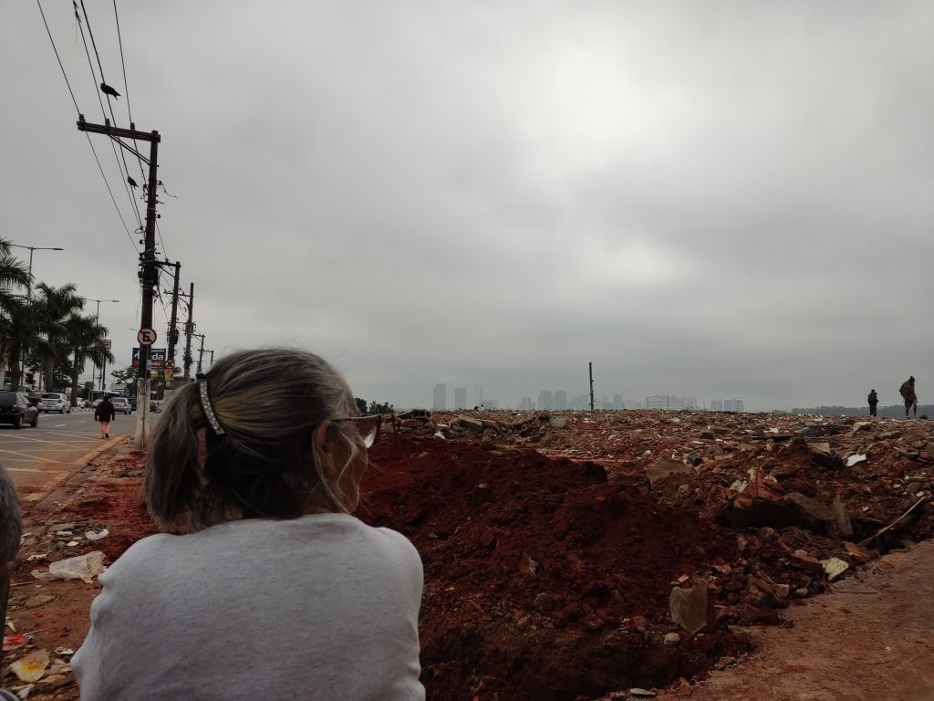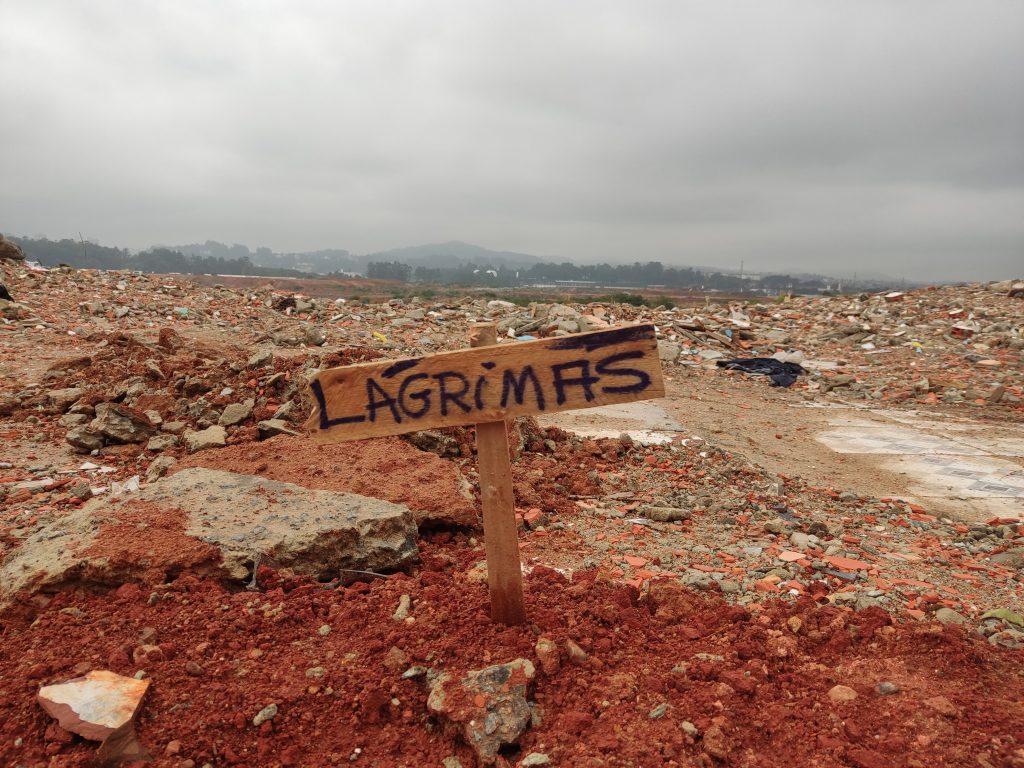 O cenário de tristeza pela destruição é ainda mais intensificado pelo dia nublado em que a reportagem foi ao local, na tarde do dia 9 de junho. No chão, entre as poças de lama, é possível ver as marcas deixadas pelos tratores. Entre os escombros, pedaços de blocos, que dias antes sustentavam paredes e abrigavam famílias.