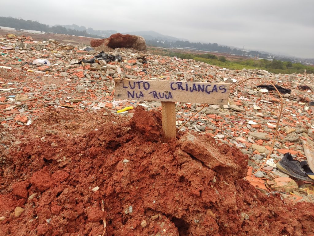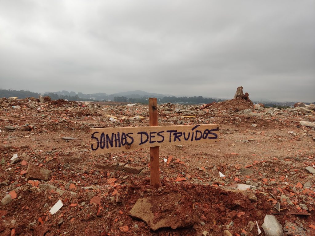 Além disso, os moradores também têm se mobilizado para realizar protestos e ações simbólicas. Uma delas ocorreu no dia 08 de junho, um grupo, incluindo a nossa entrevistada, confeccionou 50 cruzes de madeira e as fixou na área despejada, formando uma espécie de cemitério.