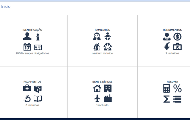 Após iniciar a declaração, você terá uma série de campos para preencher. Os mais simples são os campos identificação, em que você informa os seus dados pessoais e de contato, e familiares, em que você informa dados de dependentes, alimentandos, cônjuges ou inventariante.