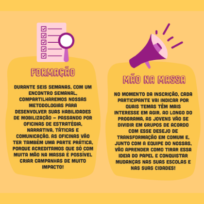 O objetivo desta mentoria é capacitar as participantes que desejam mudar e melhorar a realidade vivida nas escolas ou nas cidades. Para participar dessa formação em ativismo é necessário ser uma jovem estudante, de 14 a 18 anos, com interesse em transformação política e social.