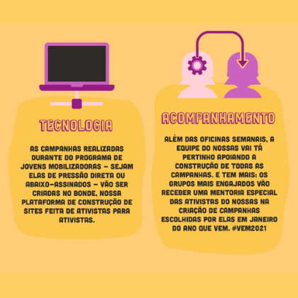 A Rede de Ativismo NOSSAS anuncia processo de inscrição para o Programa de Jovens Mobilizadoras, que oferece treinamento para mulheres estudantes, focado no aprendizado em criação de campanhas de impacto com ativistas de todo o país.