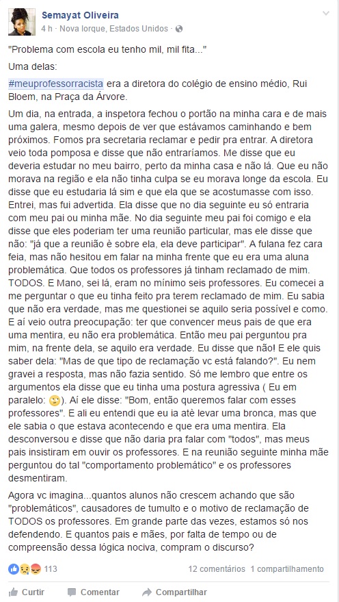 As redes sociais Facebook e Twitter foram tomadas pela hashtag #MeuProfessorRacista, que reúne relatos de pessoas que sofreram atos de racismo no ambiente escolar e universitário.