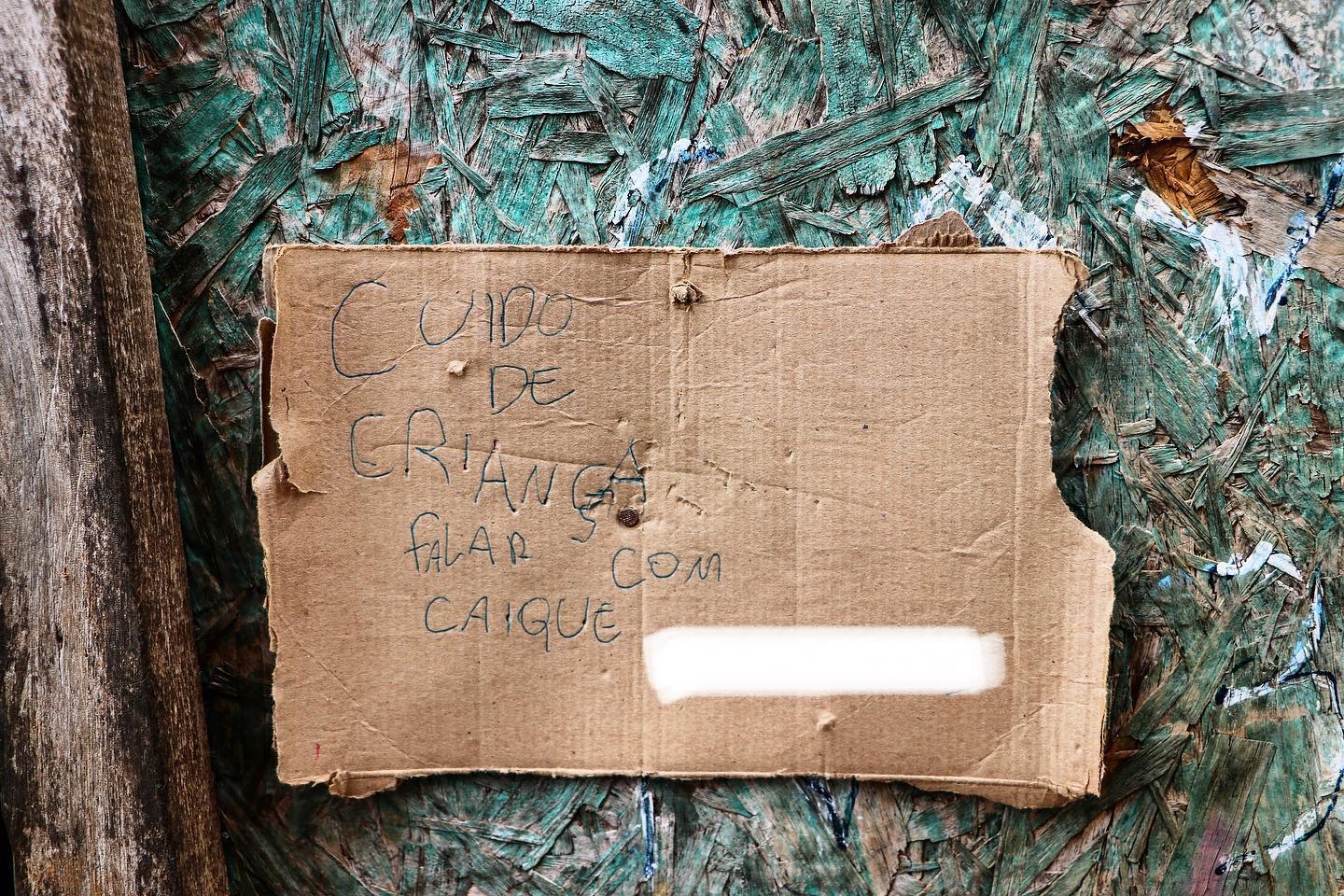 NP: A Helena é a mãe do Caique, um menino que eu conheci na favela do Rio Claro, lá em São Mateus. Eu tava fotografando em um desses dia de registro para o filme e me chamou a atenção o cartaz do filho dela. Ele colocou um cartaz na porta de casa escrito: ‘cuido de criança’. Ela trabalha de pedreira e, quando ela vai trabalhar, ele cuida dos irmãos mais novos. Aí, agora com a pandemia, como ela não tá trabalhando, começou a sair pra pegar lata e pra fazer os corres. São três filhos, sozinha. Aí, um dia ela chegou em casa e tava lá a placa. Ai eu disse: essa letra é de criança. Pedi pra conversar com ele. Disse que existem vários programas de Jovem Aprendiz e que ele pode se inscrever em alguns anos. Aí ele falou: ‘até lá eu fico vendo minha mãe passando veneno pra cuidar de nóis? Eu quero trabalhar, quero comprar minhas paradas, comprar as paradas pra minha irmã. A gente come arroz e feijão. Eu comia carne na escola, não tá tendo escola. Eu quero trabalhar, comprar carne moída, comprar ovo’. Aquilo mexeu comigo demais. Ai eu fiz uma postagem no Facebook. Quando eu acordei no dia seguinte, a postagem tinha uns 400 compartilhamentos, só com a foto do bilhete dele. E aí eu liguei pra ela e disse que tinha gente querendo ajudar. Com o dinheiro ela pagou conta, comprou botijão de gás. Pra mim é isso, volta no asé. E é isso que eu quero fazer, o audiovisual tem esse poder, sabemos que tem. Eu só quero seguir assim e ocupar o meu espaço.