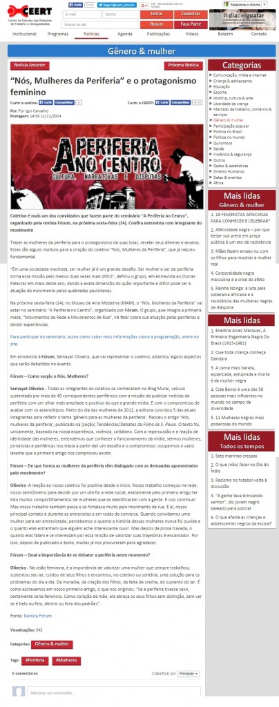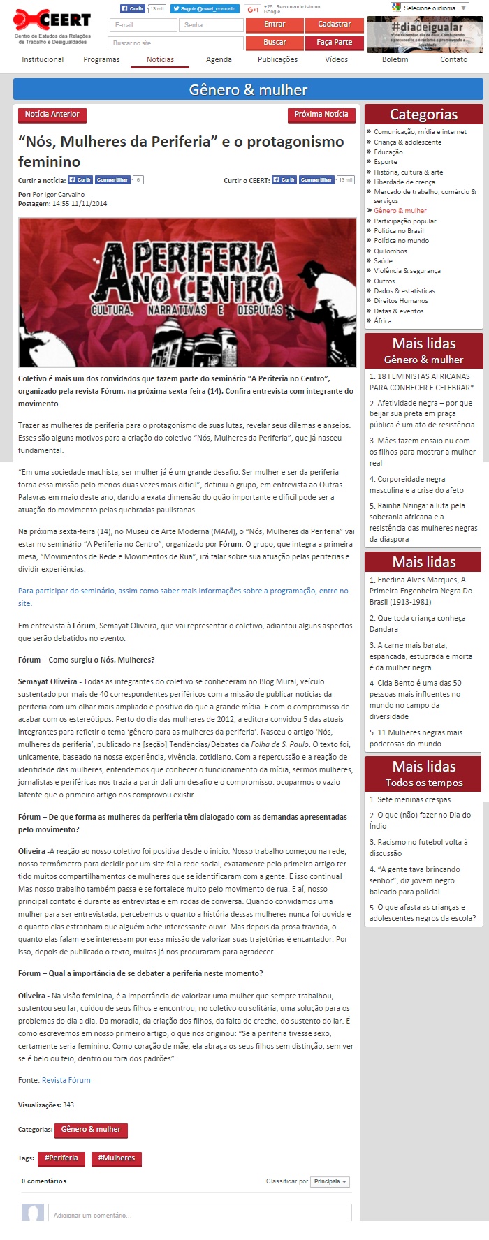 Nós, mulheres da periferia no site do Centro de Estudos das Relações de Trabalho e Desigualdade (CEERT). http://www.ceert.org.br/noticias/genero-mulher/5693/nos-mulheres-da-periferia-e-o-protagonismo-feminino