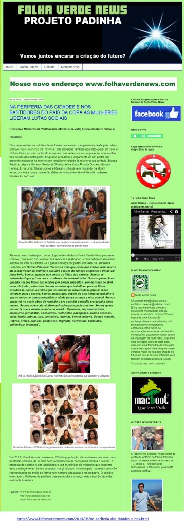 Matéria o nosso coletivo “Nós, mulheres da periferia” publicada no site Folha Verde News no dia 3/6/2014.
