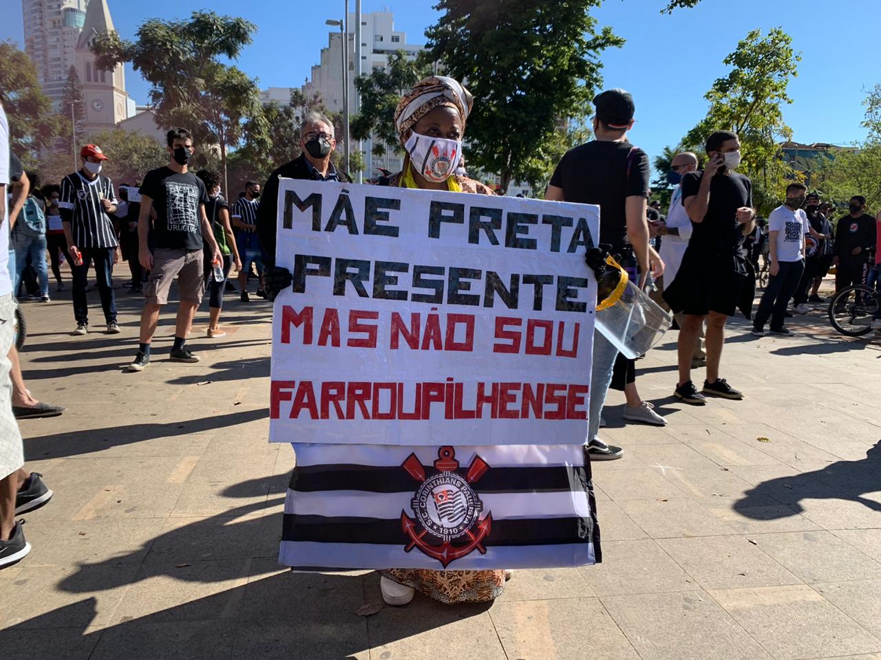 “O que me traz aqui hoje é dar voz aos negros que morreram é aos que não puderam protestar. Venho protestar pelas mortes, não só no Brasil, mas também em outros lugares. Em muitos momentos, me sinto oprimida pela sociedade como jovem negra brasileira e eu sinto que, por ser negra, sou calada”, desabafa. “Estar aqui é colocar minha voz ao alto para todo mundo ouvir. Tenho medo, mas estou tomando todas as precauções para não levar o vírus para a periferia. Mesmo com peso na consciência eu vim, eu senti que precisava estar aqui”.
