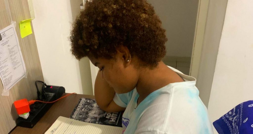 Seu objetivo com a foto? Aluna do 3º ano do Ensino Médio de uma escola estadual, ela soube da quarentena em sua unidade escolar em uma reportagem na TV. “Não achei que ficaria esses meses todos. Minha preocupação era se o conteúdo iria ser dado para a gente se preparar para o Enem”.