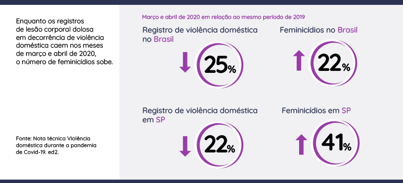 A diminuição no registro de ocorrências versus o crescimento do feminicídio revela que o isolamento social, tão necessário para o enfrentamento da pandemia, impede que as mulheres busquem ajuda, fazendo com que a letalidade da violência doméstica seja ainda maior.
