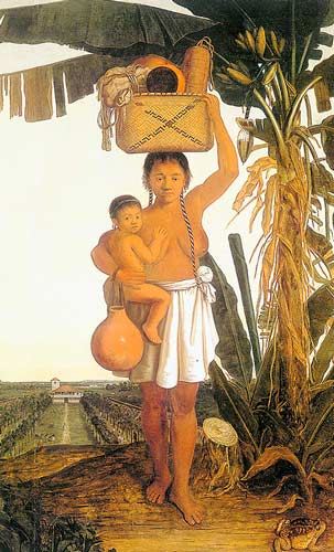 Uma negra e uma criança nos braços, solitária na floresta de concreto e aço