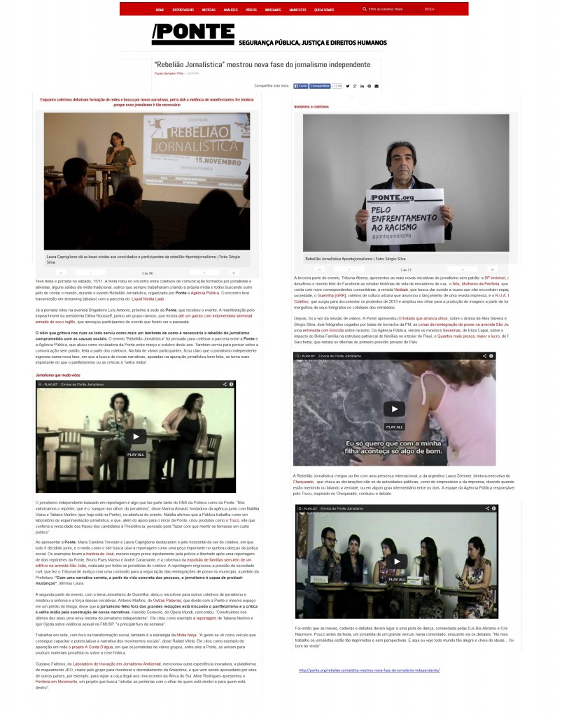 O Site Ponte, publicou matéria no dia 21/11/2014, sobre o evento “Rebelião Jornalística” e falou sobre a participação do Nós, mulheres da periferia.