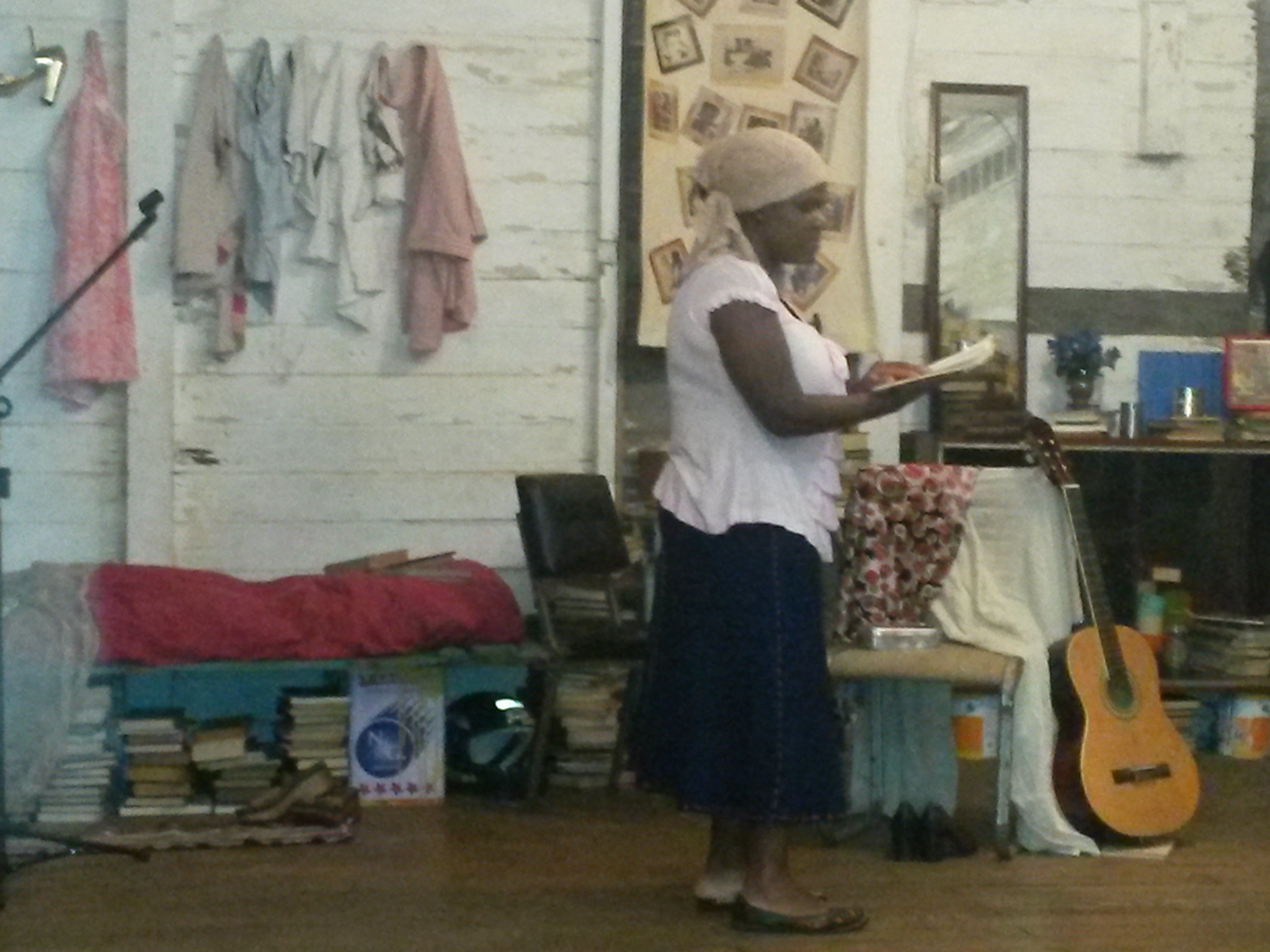 Durantes as apresentações do sarau aconteceu, ainda, a encenação da poeta Tula Pilar sobre a história de vida de Carolina Maria mesclada com sua própria trajetória.