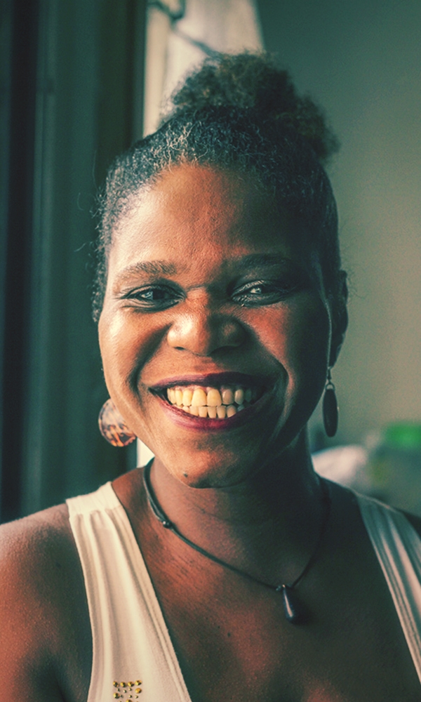 Negra com traços fortes, normalmente usando roupas que destacam sua pele e seu sorriso largo, ela não espera por perguntas e se solta para se apresentar sem eira nem beira, sempre com o astral lá em cima.