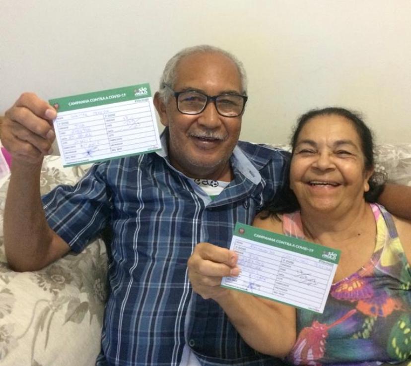 A aposentada Raimunda Conceição Pereira, de 68 anos, moradora da Brasilândia, recebeu a vacinação por meio da antecipação divulgada pela Secretaria de Saúde, que permite distribuir os lotes excedentes para pessoas acima de 60 anos. Raimunda foi acompanhar o esposo, Walter Pereira, de 83 anos, e garantiu a vacina também.